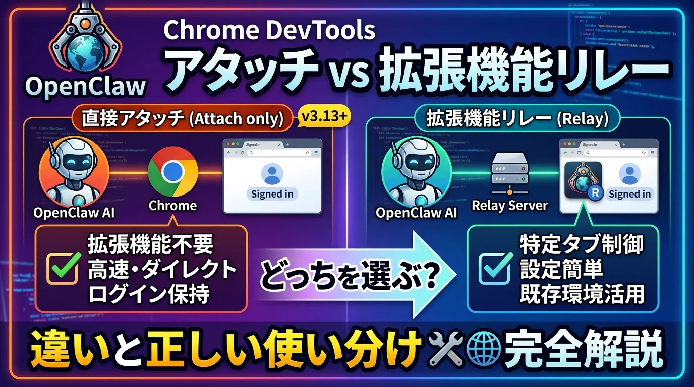 OpenClaw:Chrome DevToolsアタッチと拡張機能リレーの違い・正しい使い分け 🔧🌐完全解説